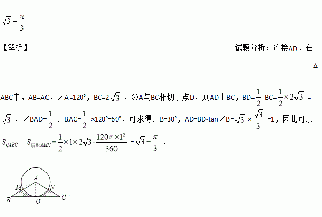 如图,在△ABC中,AB=AC,∠A=120°,BC=2,⊙A与BC相切于点D,且交AB,AC于M,N两点,则图中阴影部分的面积是___(保留π).