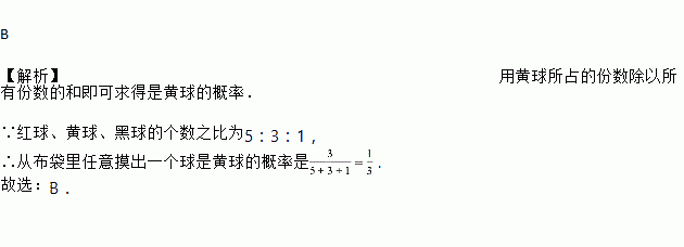 一个布袋里放有红色、黄色、黑色三种球,它们除颜色外其余都相同,红球、黄球、黑球的个数之比为5:3:1,则从布袋里任意摸出一个球是黄球的概率是( )