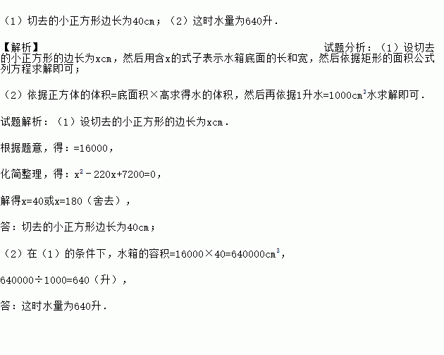 (1)若水箱的底面积为16000cm2,请求出切去的小正方形边长;