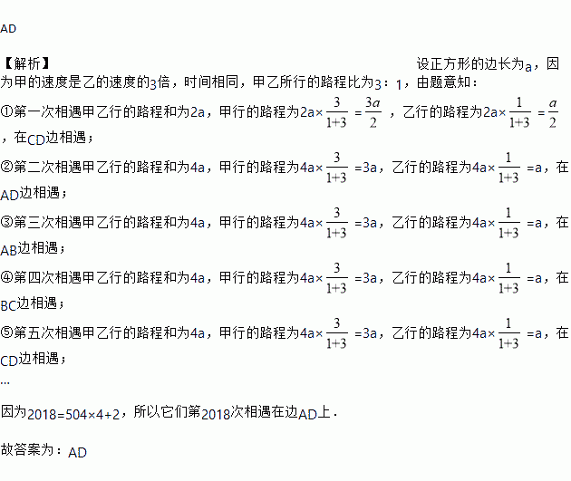 如图,甲、乙两动点分别从正方形ABCD的顶点A、C同时沿正方形的边开始移动,甲点依顺时针方向环行,乙点依逆时针方向环行.若甲的速度是乙的速度的3倍,则它们第2018次相遇在___边上.