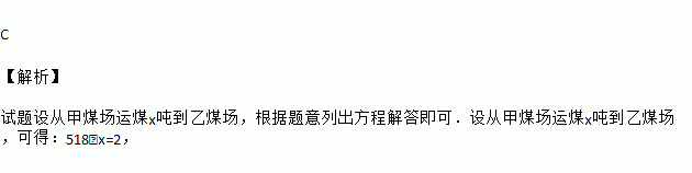 已知甲煤场有煤518吨,乙煤场有煤106吨,为了使甲煤场存煤是乙煤场的2倍,需要从甲煤场运煤到乙煤场,设从甲煤场运煤x吨到乙煤场,则可列方程为( )