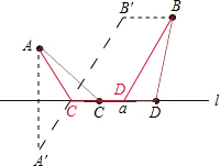 分析:先作出点A关于I的对称点A′,B点向左平移到B′(平移的长度为定值a),再连接A'B′,与l交于C,再作BD∥A′B′,与l交于D,即可确定点D、C.