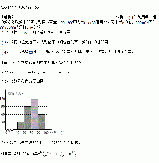 (4)如果比赛成绩80分以上(含80分)为优秀,那么该竞赛项目的优秀率是多少?