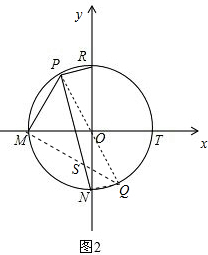 (3)连接PO并延长交⊙O于Q,连接MQ交PN于S,连接NQ,如图2,根据圆周角定理可得∠MPN=$\frac{1}{2}$∠MON=45°,∠PMQ=∠PNQ=90°,即可得到∠PSM=∠NSQ=∠SQN=45°,从而可得到PS=$\sqrt{2}$PM,NS=NQ.由∠POR=∠NOQ可得到PR=NQ,则有PR=NS,从而可得PN-PR=PN-NS=PS=$\sqrt{2}$PM,即可得到$\frac{PN-PR}{PM}$=$\sqrt{2}$(定值),PN-PR随点P的变化而变化,不是定值.