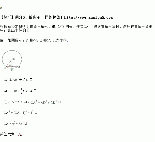 如图,AB为⊙O的弦,AB=8,OC⊥AB于点D,交⊙O于点C,且CD=1,则⊙O的半径为( )