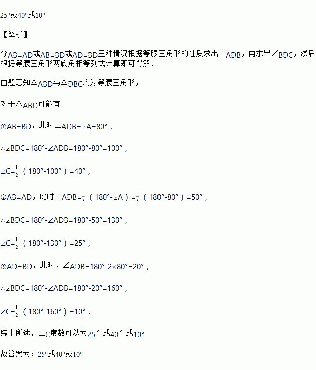 有一张三角形纸片ABC,∠A=80°,点D是AC边上一点,沿BD方向剪开三角形纸片后,发现所得两张纸片均为等腰三角形,则∠C的度数可以是__________.