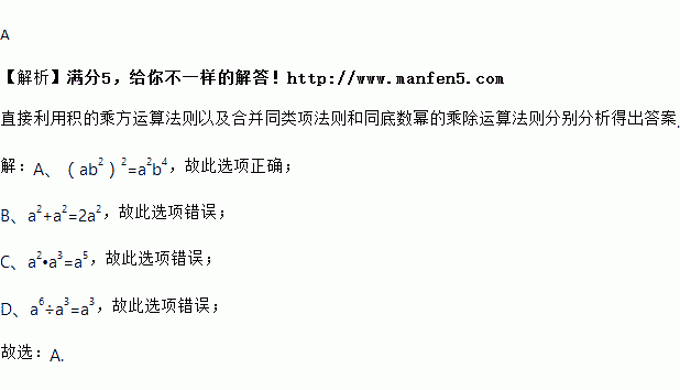 A. (ab2)2=a2b4 B. a2+a2=2a4 C. a2•a3=a6 D. a6÷a3=a2