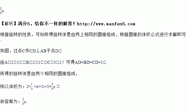 如图,在平面直角坐标系中,的三个顶点的坐标分别是、、,如果沿着边旋转,则所得旋转体的体积是________(结果保留).