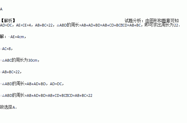 如图:△ABC的周长为30cm,把△ABC的边AC对折,使顶点C和点A重合,折痕交BC边于点D,交AC边与点E,连接AD,若AE=4cm,则△ABD的周长是( )