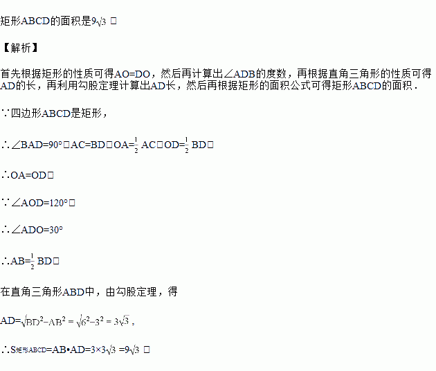 如图,在矩形ABCD中,对角线AC与BD相交于点O,∠AOD=120°,BD=6,求矩形ABCD的面积.