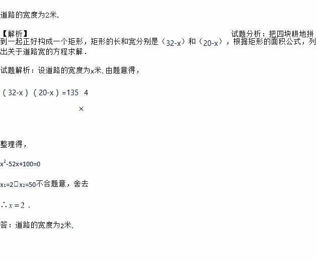 某校的分校区规划时决定在长为32米,宽为20米的长方形草坪中央修筑同样宽的两条互相垂直的小路,把长方形草坪分割成同样面积的的四块小草坪,每块小草坪的面积为135平方米,问道路的宽是多少米?