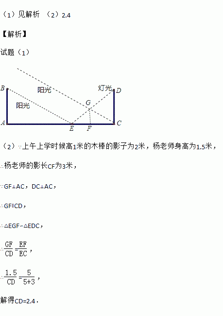 (2)ÈôÉÏÎçÉÏѧʱºò¸ß1Ã׵ľ°ôµÄÓ°×ÓΪ2Ã×£¬ÑîÀÏʦÉí¸ßΪ1.5Ã×£¬ËûÀëÀï³Ì±®EÇ¡5Ã×£¬Ç󷵯¸ß£®