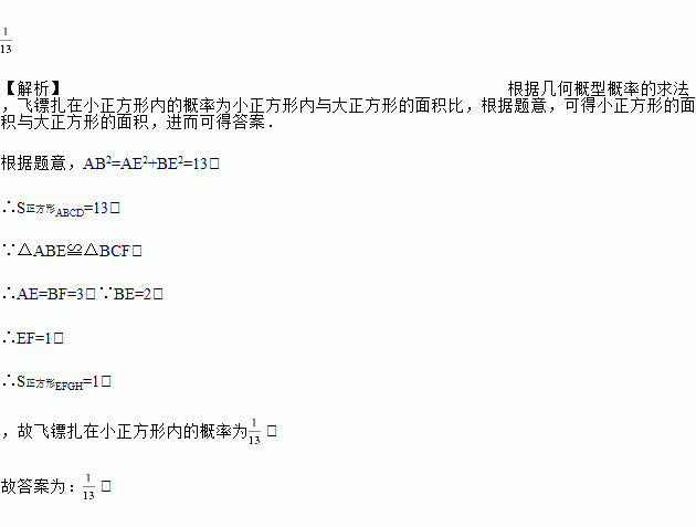 如图,这个图案是3世纪我国汉代数学家赵爽在注解《周髀算经》时给出的,人们称它为“赵爽弦图”.已知AE=3,BE=2,若向正方形ABCD内随意投掷飞镖(每次均落在正方形ABCD内,且落在正方形ABCD内任何一点的机会均等),则恰好落在正方形EFGH内的概率为_____.