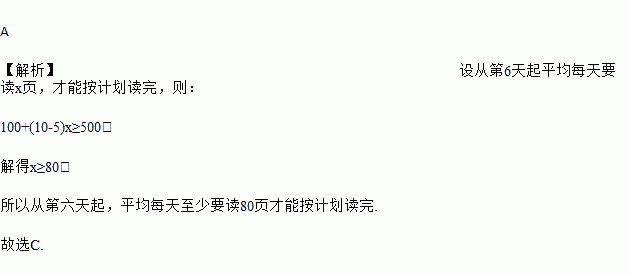 小红读一本500页的书,计划10天内读完,前5天因种种原因只读了100页,为了按计划读完,则从第六天起平均每天至少要读( )