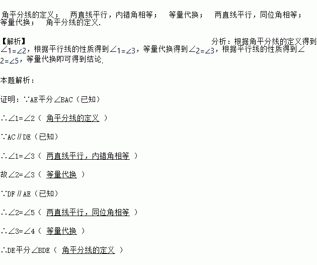 阅读下列推理过程,在括号中填写理由. 已知:如图,点D,E分别在线段AB、BC上,AC∥DE,DF∥AE交BC于点F,AE平分∠BAC.求证:DF平分∠BDE
