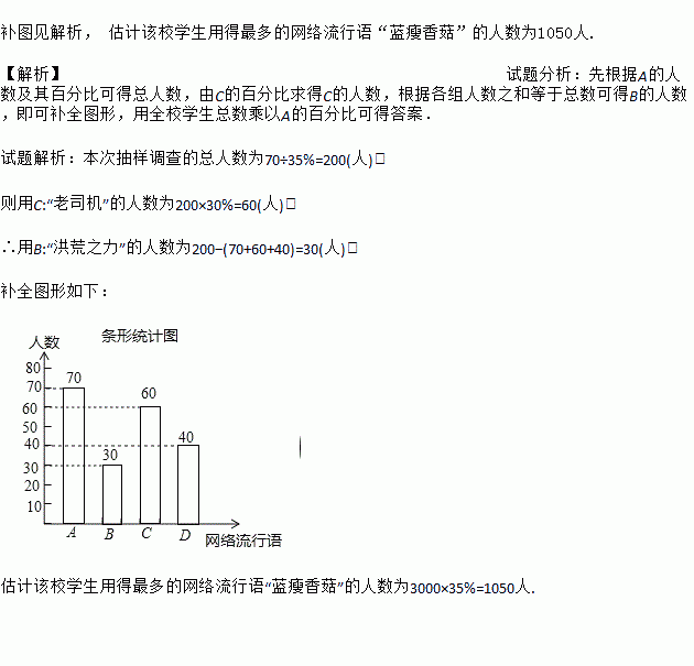 在网络时代里,每年网络上都会出现很多红极一时的网络流行语,为了解同学们对网络流行语的使用情况,某数学兴趣小组选取了其中的 A:“蓝瘦香菇”,B:“洪荒之力”,C:“老司机”,D:“套路”四个网络流行语在全校3000名学生中进行了抽样调查,要求每位被调查学生只能从中选择一个自己用得最多的网络流行语.根据调查结果,该小组绘制了如下两幅不完整的统计图,根据图中提供的信息,请补全条形统计图并估计该校学生用得最多的网络流行语.