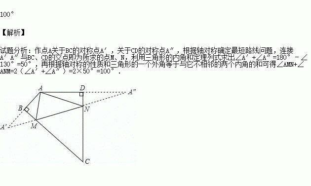 如图,四边形ABCD中,∠BAD=130°,∠B=∠D=90°,在BC、CD上分别找一点M、N,使△AMN周长最小时,则∠AMN+∠ANM的度数为 .