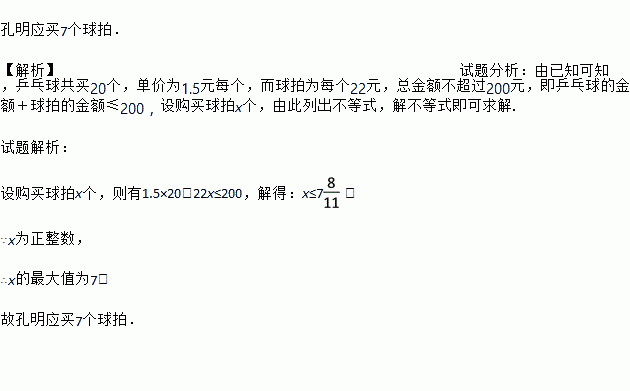 为了举行班级晚会,孔明准备去商店购买20个乒乓球做道具,并买一些乒乓球拍做奖品.已知乒乓球每个1.5元,球拍每个22元.如果购买金额不超过200元,且买的球拍尽可能多,那么孔明应该买多少个球拍?