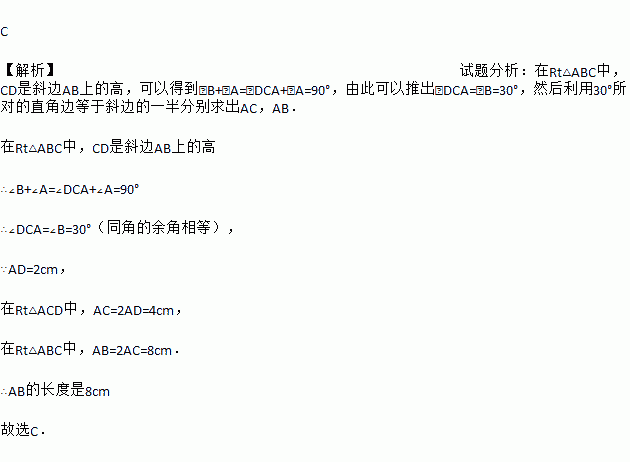 Rt△ABC中,CD是斜边AB上的高,∠B=30°,AD=2cm,则AB的长度是( )。