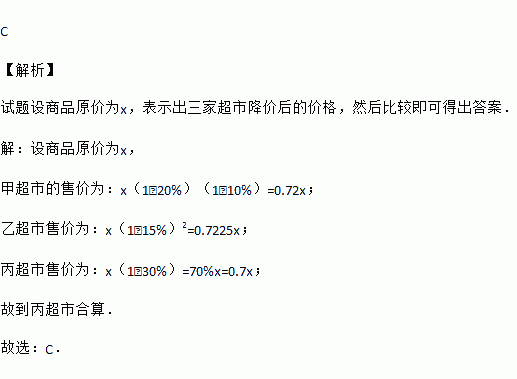 甲、乙、丙三家超市为了促销一种定价相同的商品,甲超市先降价20%,后又降价10%;乙超市连续两次降价15%;丙超市一次性降价30%.则顾客到哪家超市购买这种商品更合算( )
