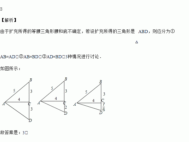 如图,某小区有一块直角三角形绿地,量得直角边AC=4m,BC=3m,考虑到这块绿地周围还有足够多的空余部分,于是打算将这块绿地扩充成等腰三角形,且扩充部分是以AC为一条直角边的直角三角形,则扩充的方案共有_____种.
