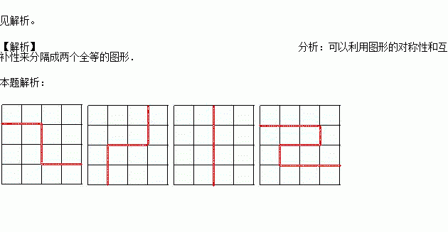 下图是几个4×4的正方形方格图,请沿着格线画出四种不同的分法,把它分成两个全等图形。