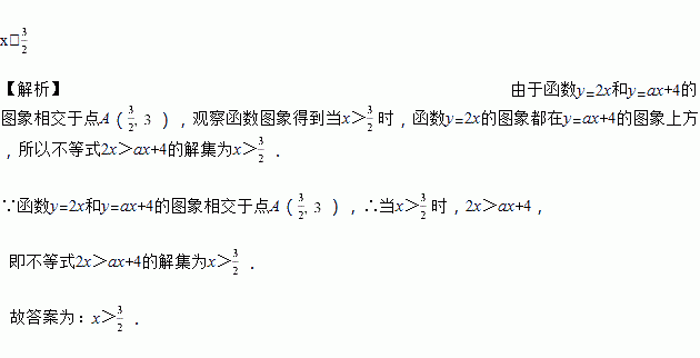 如图,函数y=2x和y=ax+4的图象相交于点A(,3),则不等式2x>ax+4的解集为___.