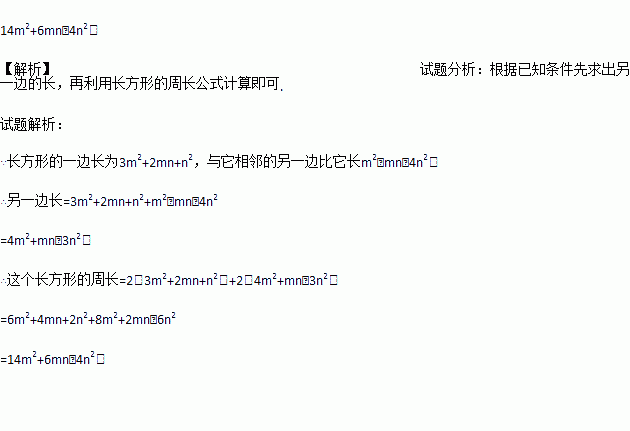 一个长方形的一边长为3m2+2mn+n2,与它相邻的另一边比它长m2﹣mn﹣4n2,求这个长方形的周长.