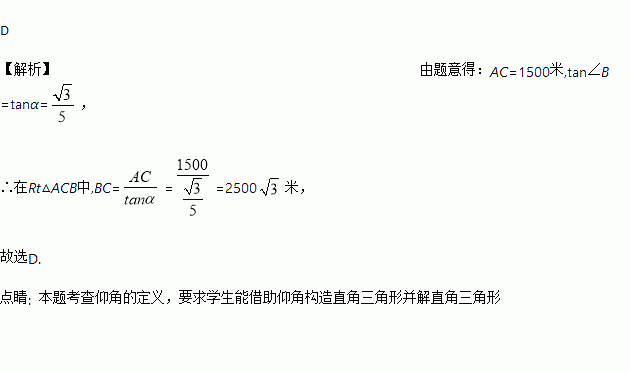 在寻找马航MH370航班过程中,某搜寻飞机在空中A处发现海面上一块疑似漂浮目标B,此时从飞机上看目标B的俯角为α.如图,已知飞行高度AC=1500米,tanα=
