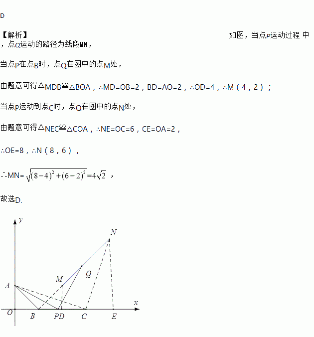 如图,在平面直角坐标系中A(0,2),B(2,0),C(6,0)点P在线段BC上由点B向C运动,连接AP,将线段AP绕点P顺时针旋转90°得到线段QP,当点P运动过程 中,点Q运动的路径长为( )