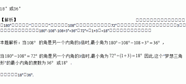 当三角形中一个内角是另一个内角的3倍时,我们称此三角形为“梦想三角形”.如果一个“梦想三角形”有一个角为108°,那么这个“梦想三角形”的最小内角的度数为_____.