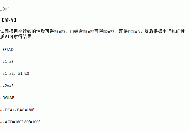 如图,EF/AD,∠BEF=∠ADG,∠BAC=80°,求∠AGD的度数。
