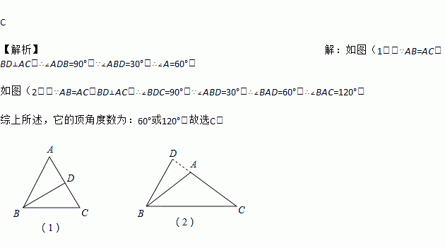 C 【解析】【解析】 如图(1),∵AB=AC,BD⊥AC,∴∠ADB=90°,∵∠ABD=30°,∴∠A=60°; 如图(2),∵AB=AC,BD⊥AC,∴∠BDC=90°,∵∠ABD=30°,∴∠BAD=60°,∴∠BAC=120°; 综上所述,它的顶角度数为:60°或120°.故选C.