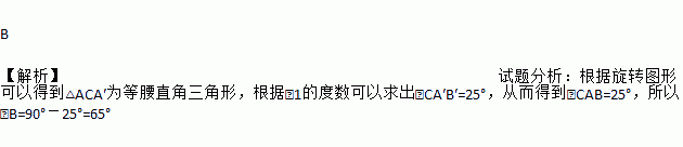 B 【解析】试题分析:根据旋转图形可以得到△ACA′为等腰直角三角形,根据∠1的度数可以求出∠CA′B′=25°,从而得到∠CAB=25°,所以∠B=90°-25°=65°