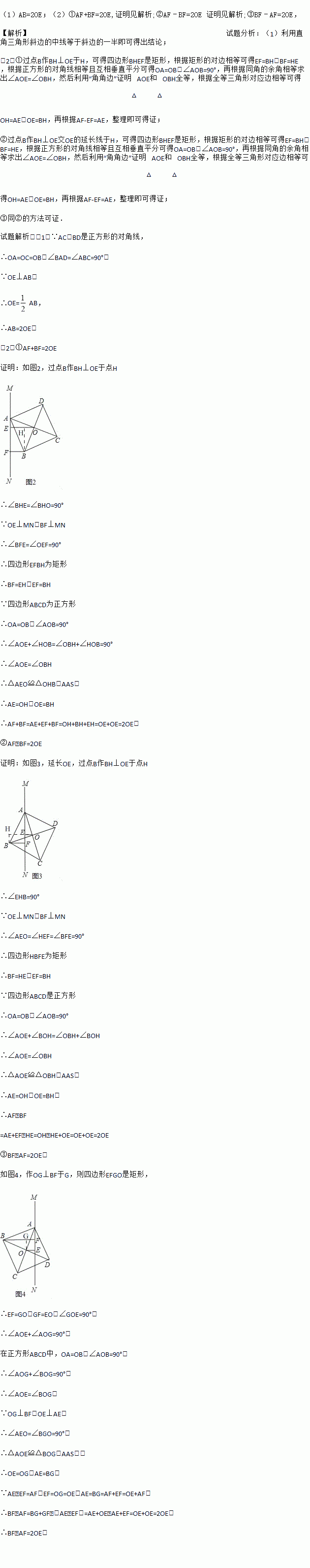 (1)AB=2OE;(2)①AF+BF=2OE,证明见解析;②AF﹣BF=2OE 证明见解析;③BF﹣AF=2OE, 【解析】试题分析:(1)利用直角三角形斜边的中线等于斜边的一半即可得出结论; (2)①过点B作BH⊥OE于H,可得四边形BHEF是矩形,根据矩形的对边相等可得EF=BH,BF=HE,根据正方形的对角线相等且互相垂直平分可得OA=OB,∠AOB=90°,再根据同角的余角相...