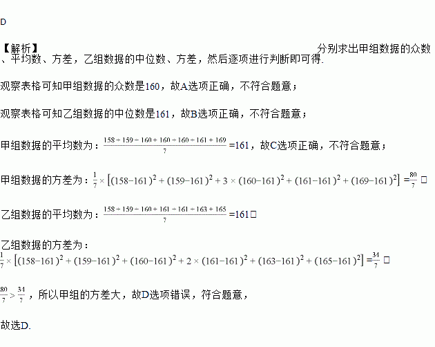 C. 甲组同学身高的平均数是161 D. 两组相比,乙组同学身高的方差大