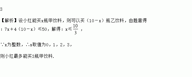 小红准备用50元钱买甲、乙两种饮料共10瓶,已知甲饮料每瓶7元,乙饮料每瓶4元,则小红最多能买 瓶甲饮料.