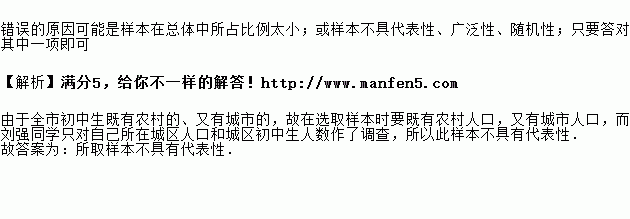 刘强同学为了调查全市初中生人数,他对自己所在城区人口和城区初中生人数作了调查:城区人口约3万,初中生人数约1200.全市人口实际约300万,为此他推断全市初中生人数为12万.但市教育局提供的全市初中生人数约8万,与估计数据有很大偏差.请你根据所学的统计知识,找出其中错误的原因______________.