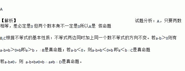 A 【解析】试题分析:A,只要两数相等,差必定是0 但两个数本身不一定是0所以A是 假命题 B,C根据不等式的基本性质:不等式两边同时加上同一个数不等式的方向不变。若a-b>0则有 a-b+b>0+b即a>b ,∴B是真命题;若a-b<0,则a-b+b<0+b 即a<b ∴C是真命题 若a-b≠0,则 a-b+b≠0+b ∴ a≠b ∴ D是真命题。