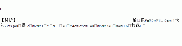 C 【解析】解:把P=﹣2a﹣1,Q=a+1代入2P﹣Q=0,得 2(﹣2a﹣1)﹣(a+1)=0,﹣4a﹣2﹣a﹣1=0,﹣5a﹣3=0,a=﹣0.6.故选C.