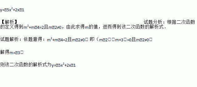 y=﹣5x2+2x﹣1 【解析】试题分析:根据二次函数的定义得到m2+m﹣4=2且m﹣2≠0,由此求得m的值,进而得到该二次函数的解析式. 试题解析:依题意得:m2+m﹣4=2且m﹣2≠0. 即(m﹣2)(m+3)=0且m﹣2≠0, 解得m=﹣3, 则该二次函数的解析式为y=﹣5x2+2x﹣1