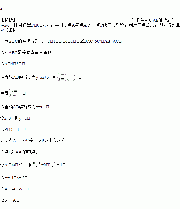 如图,在平面直角坐标系中,△ABC的顶点A在第一象限,点B,C的坐标分别为(2,1),(6,1),∠BAC=90°,AB=AC,直线AB交y轴于点P,若△ABC与△A′B′C′关于点P成中心对称,则点A′的坐标为( )