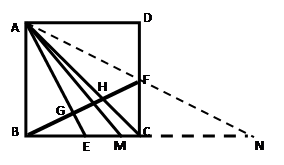 在正方形ABCD中,点E是BC边的中点,过B点作BG⊥AE于点G,交AC于H,交CD于点F。(1)求证:点F为边BC的中点;(2)如果正方形的边长为4,求CH的长度;(3)如果点M是BC上的一点,且AM=MC+CD,