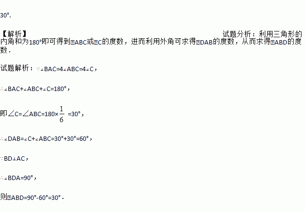 如图,在△ABC中,∠BAC=4∠ABC=4∠C,BD⊥AC交CA的延长线于点D,求∠ABD的度数.