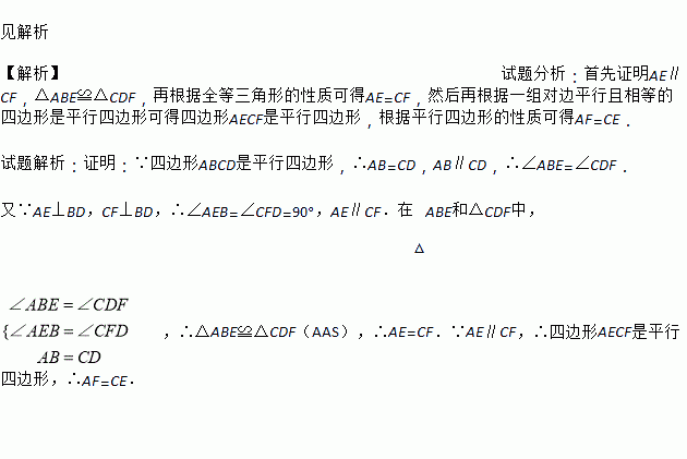 如图,在□ABCD中,AE⊥BD于E,CF⊥BD于F,连接AF,CE.求证:AF=CE.