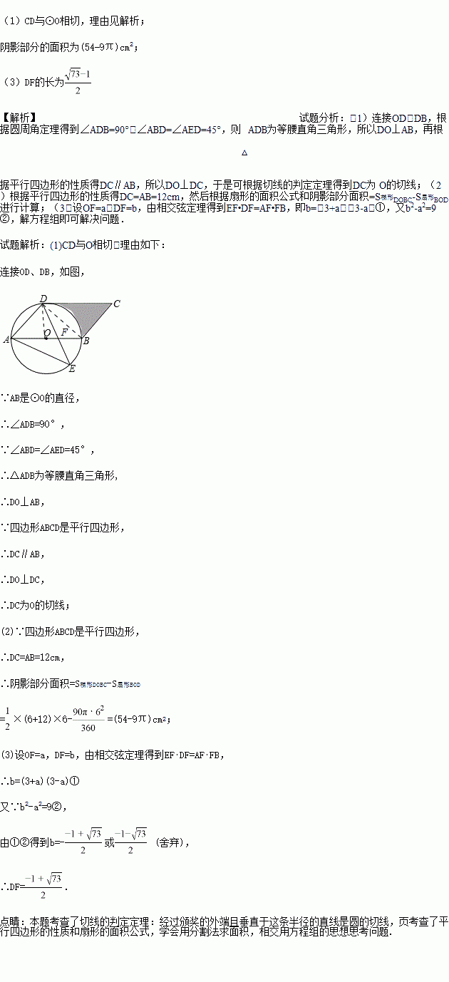 如图,四边形ABCD是平行四边形,以AB为直径的⊙O经过点D,E是⊙O上一点,若⊙O的直径为6cm,且∠AED=45°.