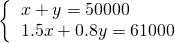 2005年某省荔枝总产量为50000吨,销售收入为61000万元.已知“妃子笑”品种售价为1.5万元/吨,其它品种平均售价为0.8万元/吨,求“妃子笑”和其它品种的荔枝产量各多少吨.如果设“妃子笑”荔枝产量为x吨,其它品种荔枝产量为y吨,那么可列出方程组为________.