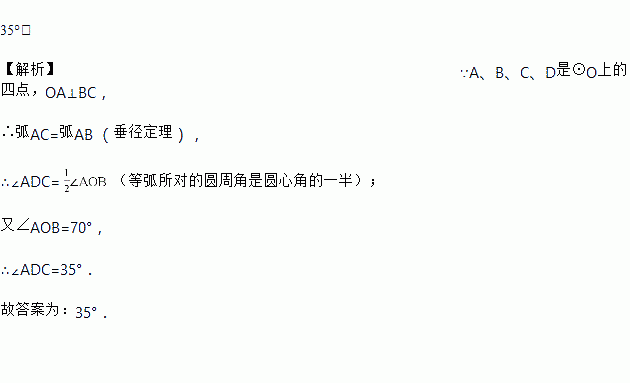 如图,BC为⊙O的弦,OA⊥BC交⊙O于点A,∠AOB=70°,则∠ADC=_________.