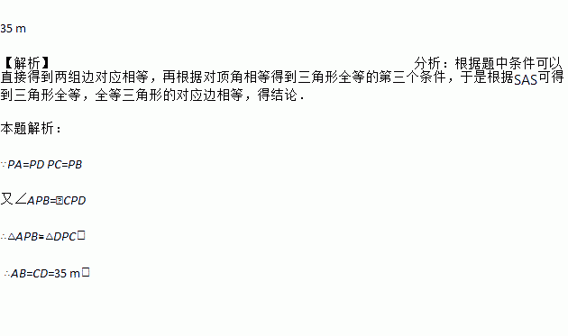 为在池塘两侧的A,B两处架桥,要想测量A,B两点的距离,如图所示,找一处看得见A,B的点P,连接AP并延长到D,使PA=PD,连接BP并延长到C,使.测得CD=35m,就确定了AB也是35m,说明其中的理由;