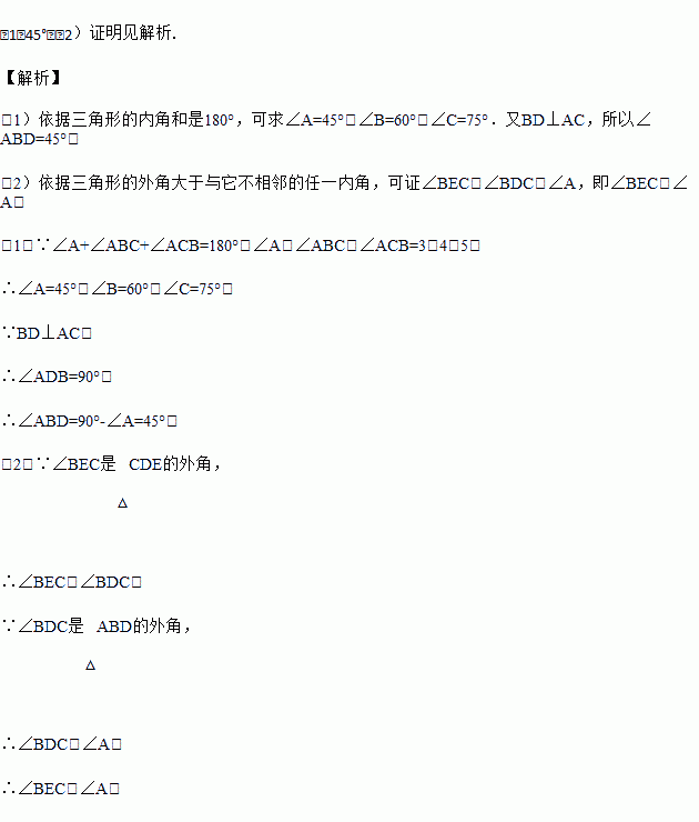 如图,在△ABC中,BD⊥AC于D.若∠A:∠ABC:∠ACB=3:4:5,E为线段BD上任一点.